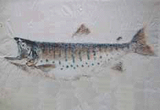 それを近年、道央・道南の渓で何度か釣った。 その度に心臓ドキドキ興奮し、舞い上がっていた。 しかし、振り返って見ると30cmオーバーのヤマベが釣れたのは、全てダムの上流である。 本来、北海道のヤマベは、ほとんど全てが海から疏上したサクラマスの子のはず。 それを思うと素直には喜べない。 放流されて海に戻らずに大きくなったのをハイパーヤマメなどといって珍重するのは、本州だけでよいのではないか。 しかし北海道には、そうではない「尺上」も存在する。 祖父が遺した大ヤマベの魚拓は、サクラマスともハイパーヤマメとも明らかに違う「ヌシ」の風格がある。 |